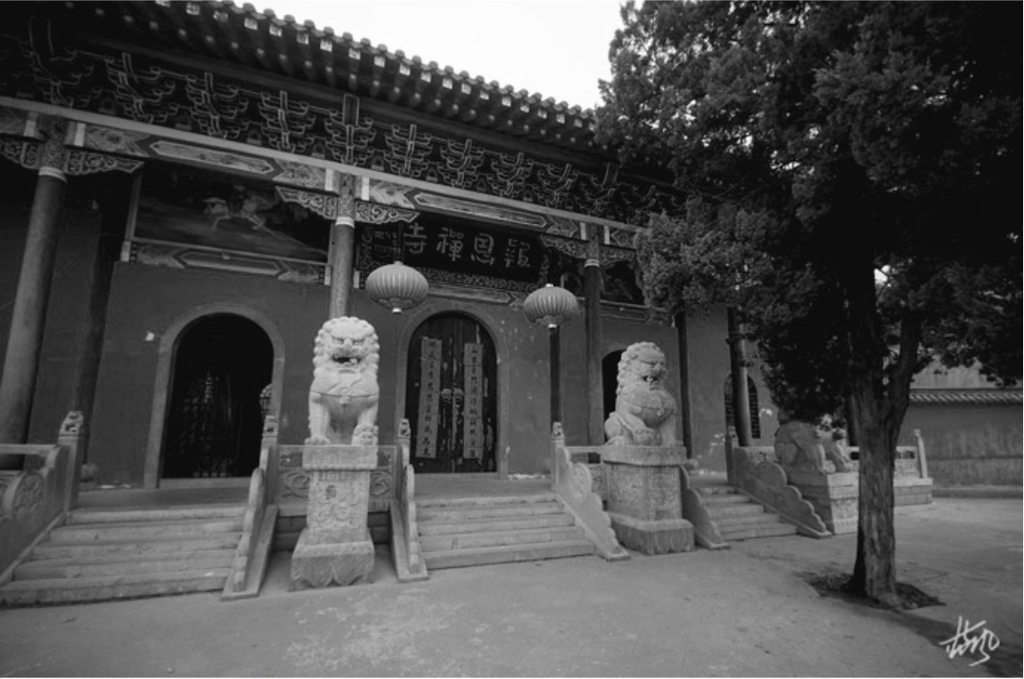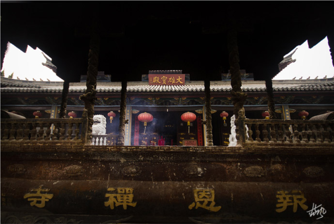 22 再穿过二佛殿,便来到第二进深院,两棵千年银杏遮天蔽日,把金碧辉煌的大雄宝殿和东西廊房掩映在绿荫之中。飞角流丹的大雄宝殿,是报恩寺的主建筑物,建在一米多高的石基上,更显威严庄重。殿面五间,进深三间,殿门前有长廊, 立石质方形廊柱,柱面有花乌浮雕,门东一柱础上有“石羊抵头,画面,生动逼真,此为“寿州内八景”之一景。