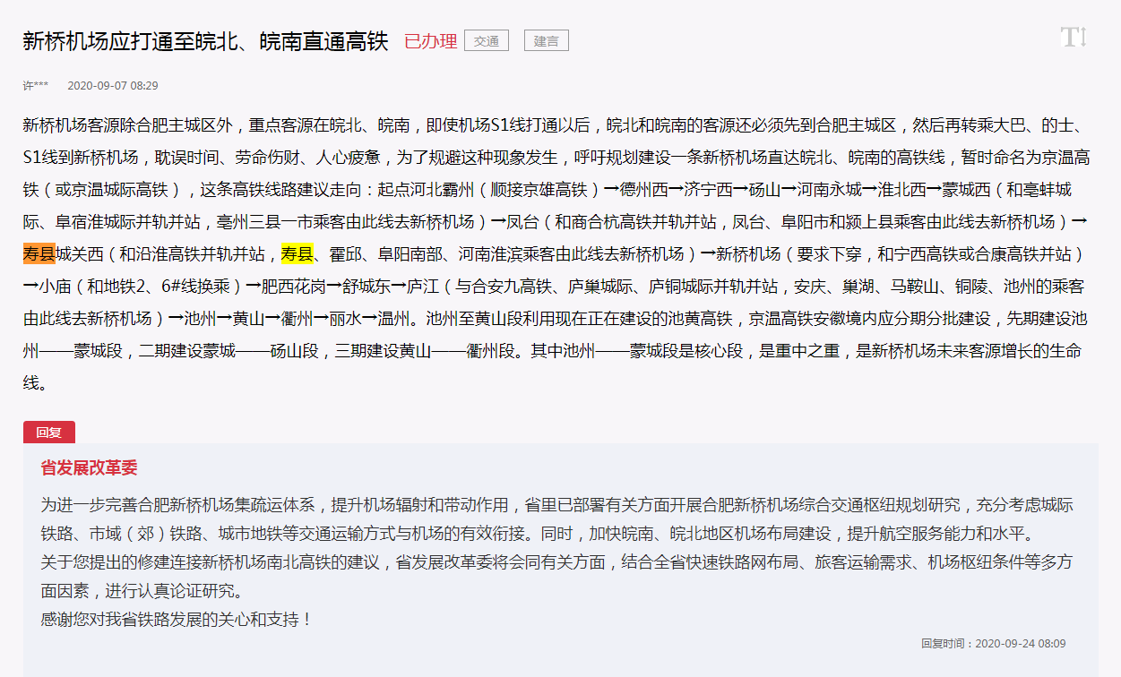 有网友建议打通以新桥机场为中心的通过寿县的贯通安徽南北的高铁: