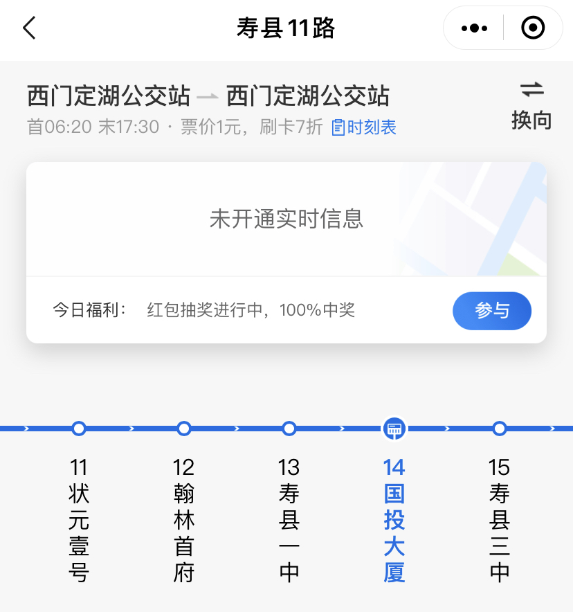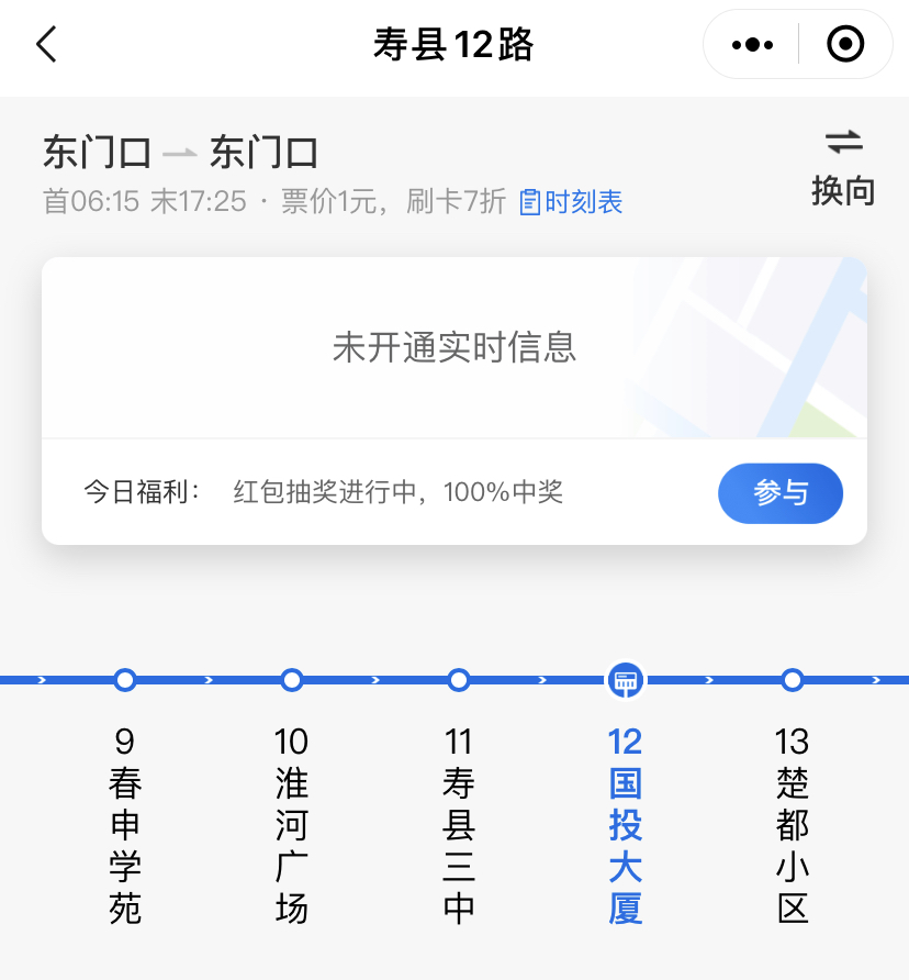 顺民公交:车来了无法显示寿县11路、12路公交车始发时间及班次间隔时间