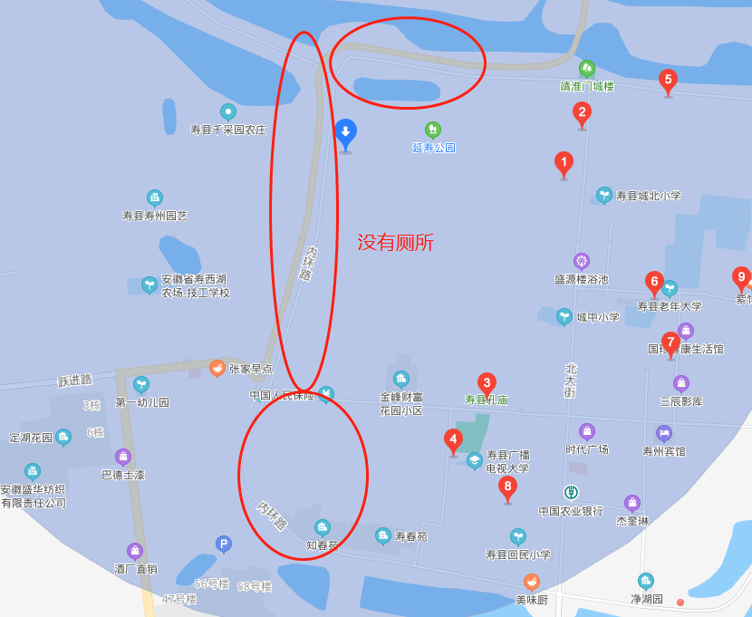 公园这么长的地点,没有公厕确实不对头。况且:除了西门口进城处的仿古楼那边设计了一个公厕 还在建,从西门到北门竟没有一个公厕?这离公园这么远,能行吗?东北环城从东门到北门记得有多达三个厕所,东南环城记得文峰广场那边也是有一个大厕所的,但是西环城的厕所是真的不够,游客在城墙上若突然有需求也非常尴尬。